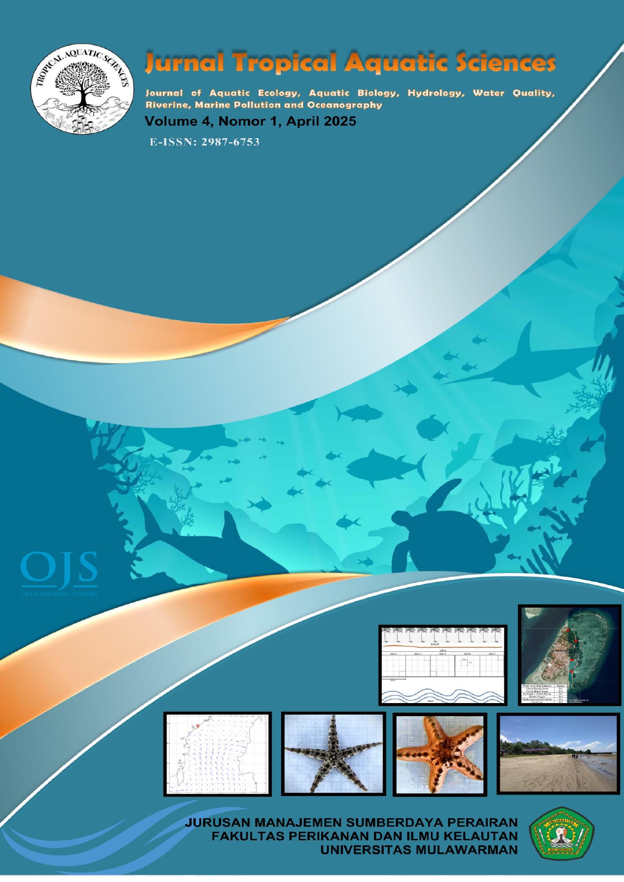 Volume 4, Issue 2 of the journal Tropical Aquatic Science presents a collection of scientific research from lecturers, researchers, and students within and outside the Faculty of Fisheries and Marine Science, Universitas Mulawarman. This issue features diverse studies on aquatic ecosystems, including coral cover in Miang Island waters, the population dynamics of the Sand Shrimp (Metapenaeus brevicornis) in Samboja Kuala, and macroplastic pollution on Manggar Beach. Coastal ecosystem research includes the condition of Rhizophora mucronata mangroves in Bontang, litter density and production in Graha Indah Balikpapan, and seagrass distribution patterns in Beras Basah Island waters. Contemporary issues are addressed through studies on microplastic content in Milkfish (Chanos chanos) from Sembilang Estuary and mesoplastic waste characteristics on Monpera Beach. The volume also covers water quality and environmental management, with research on the water quality of the Karang Mumus River, the influence of substrate on the morphometrics of Thalassia hemprichii seagrass, mangrove conditions in the Non-Forest Area (APL) of Semanting Bay, and a waste management model for the Green Nirvana Maratua Resort. The comprehensive and scientific discussions provide valuable information for the public and enrich the scientific knowledge of fisheries and marine science in Indonesia, particularly in East Kalimantan.